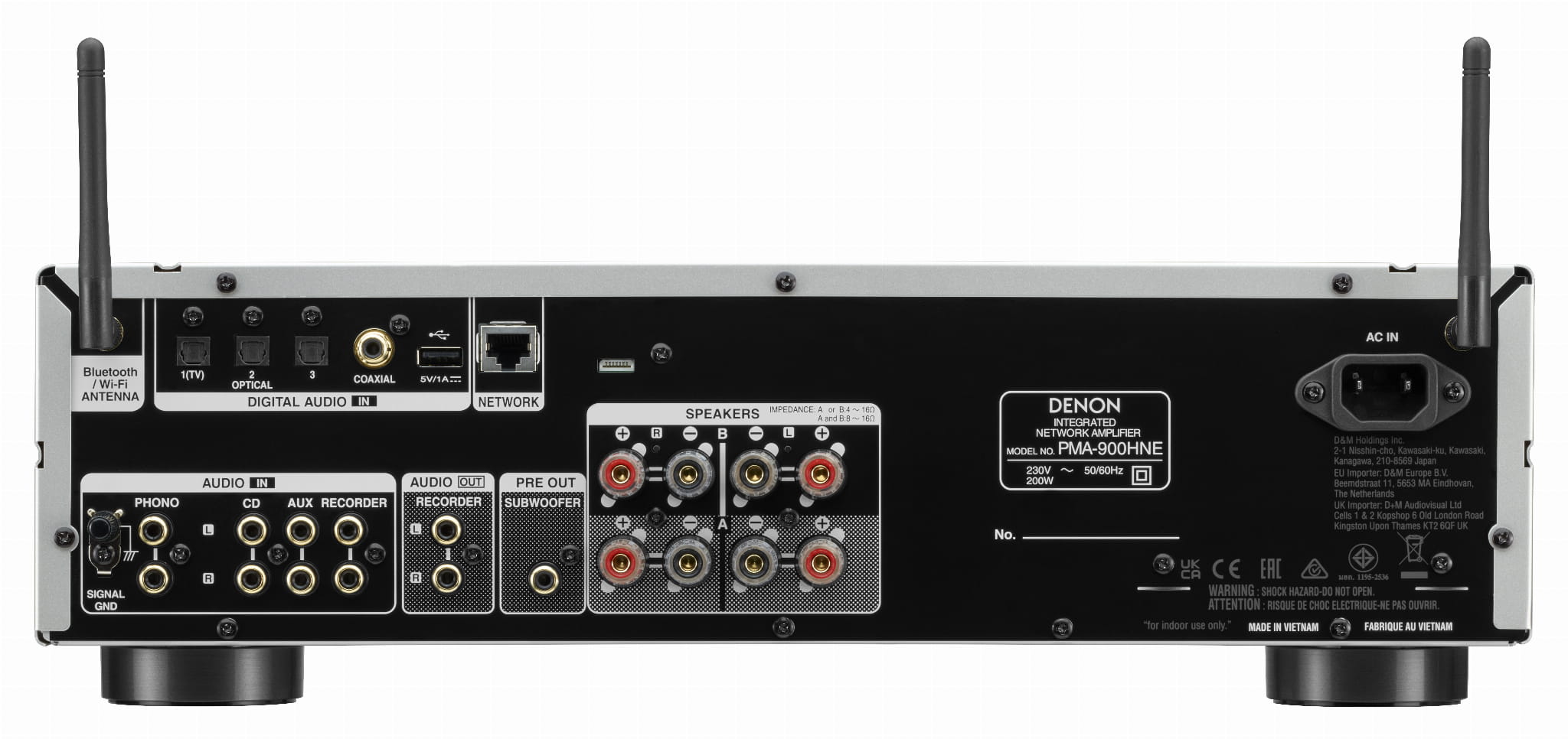 Łączność obejmuje wejście Phono na gramofony z wkładkami MM i MC, terminale głośnikowe A/B, wyjście przedwzmacniacza subwoofera, optyczne i koaksjalne wejścia cyfrowe do integracji dźwięku z telewizora i odtwarzacza multimedialnego, a także bezprzewodowe odtwarzanie dźwięku w całym domu za pośrednictwem technologii HEOS® Built-In. Popraw swoje wrażenia słuchowe z dowolnego źródła dzięki PMA900HN.
