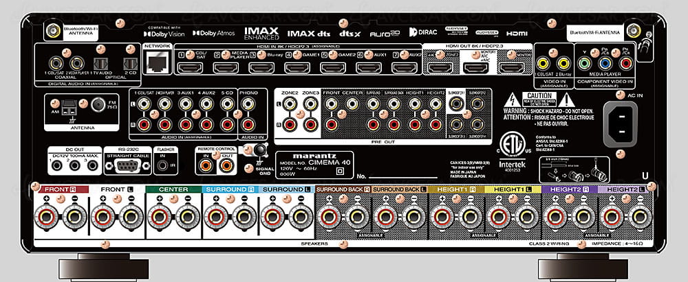 Cinema 40 to wydajny wzmacniacz AV o wysokiej mocy, stworzony zarówno do pomieszczeń wielofunkcyjnych, jak i dedykowanych kin domowych. Posiada legendarny wzmacniacz Marantz o mocy 9x125 W, siedem wejść HDMI, z których każde jest kompatybilne z 8K UHD, bezprzewodową platformę streamingową HEOS Built-In, korekcję akustyki pomieszczenia Audyssey MultEQ XT32, Dolby Atmos i DTS:X, Auro 3D oraz wiele innych wejść i wyjść, w tym wyjścia przedwzmacniacza dla wszystkich kanałów i obsługę czterech niezależnych subwooferów. 11.4 kanałowe wyjścia przedwzmacniacza pozwalają rozszerzyć układ głośników o zewnętrzne wzmocnienie.